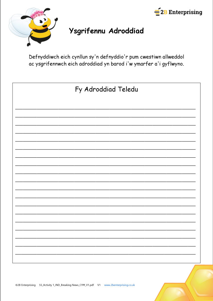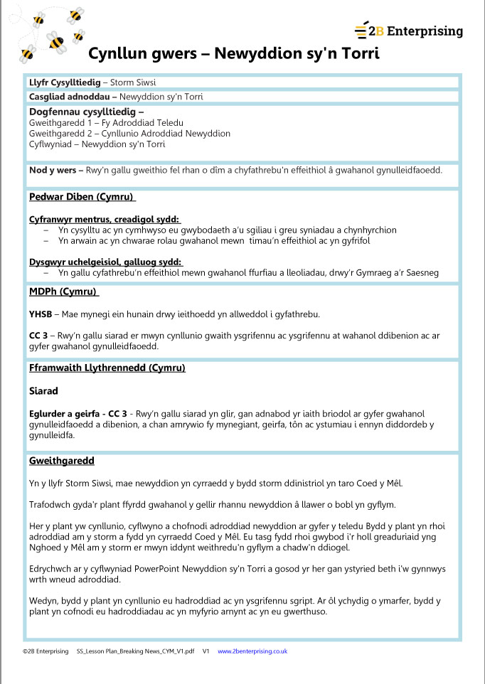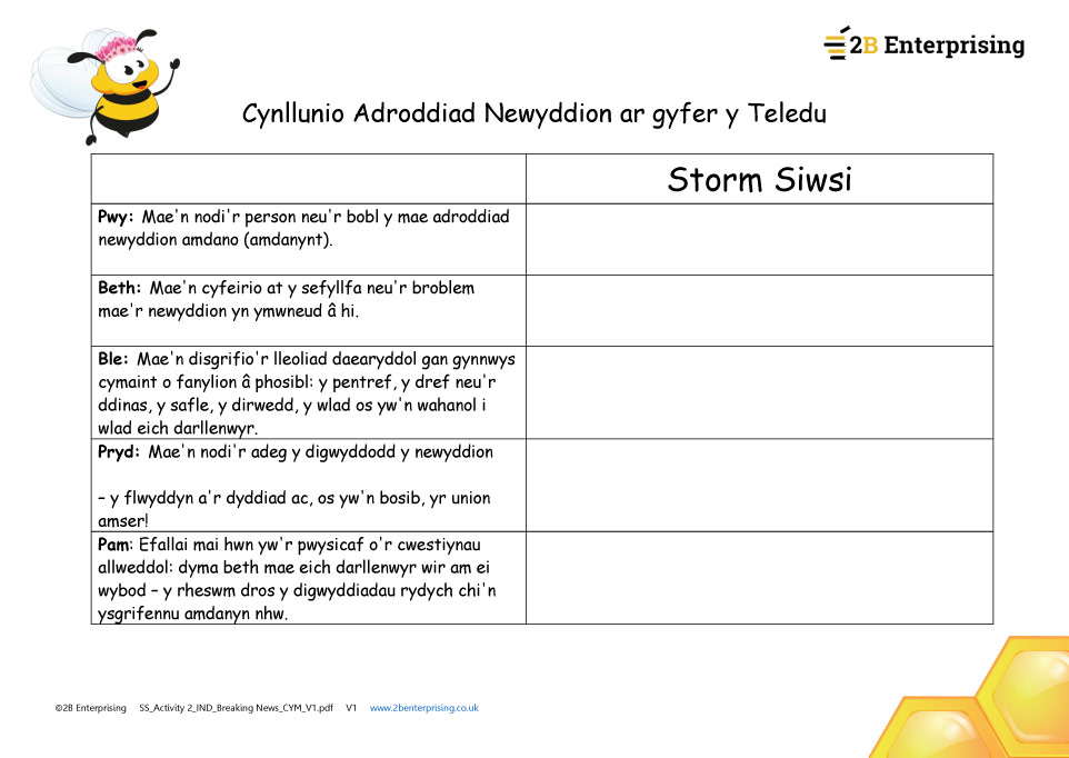 Herio disgyblion i gynllunio, cyflwyno a recordio adroddiad newyddion teledu. Bydd y disgyblion yn adrodd ar y storm a fydd yn cyrraedd Coed y Mêl.